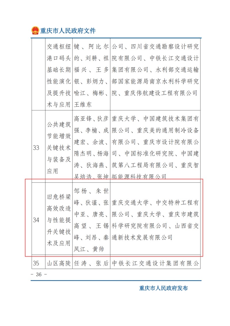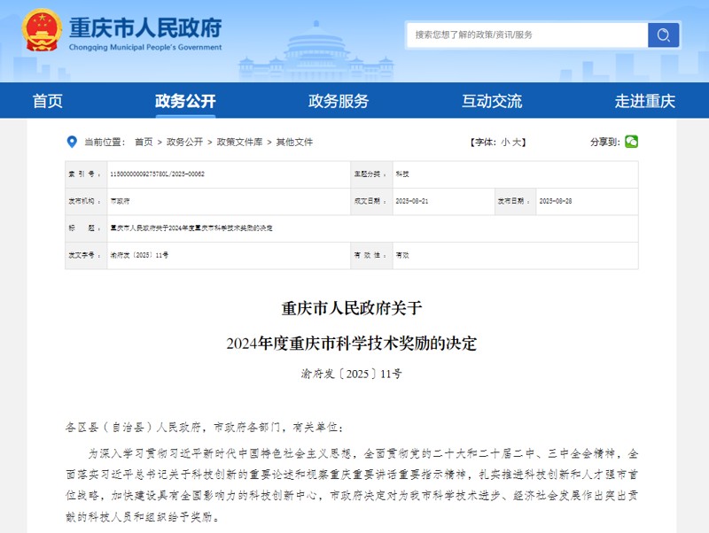 重慶市人民政府網(wǎng)站發(fā)布2024年度重慶市科學(xué)技術(shù)獎勵的獎勵決定和獲獎名單