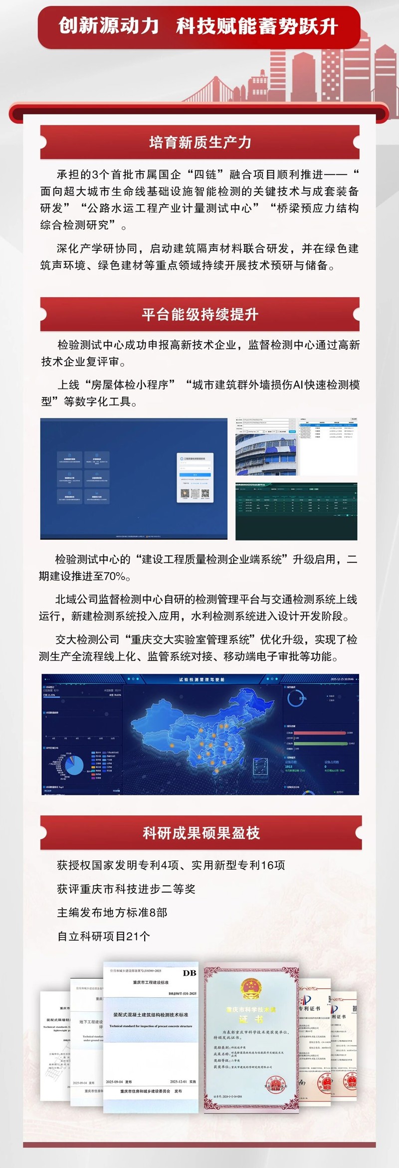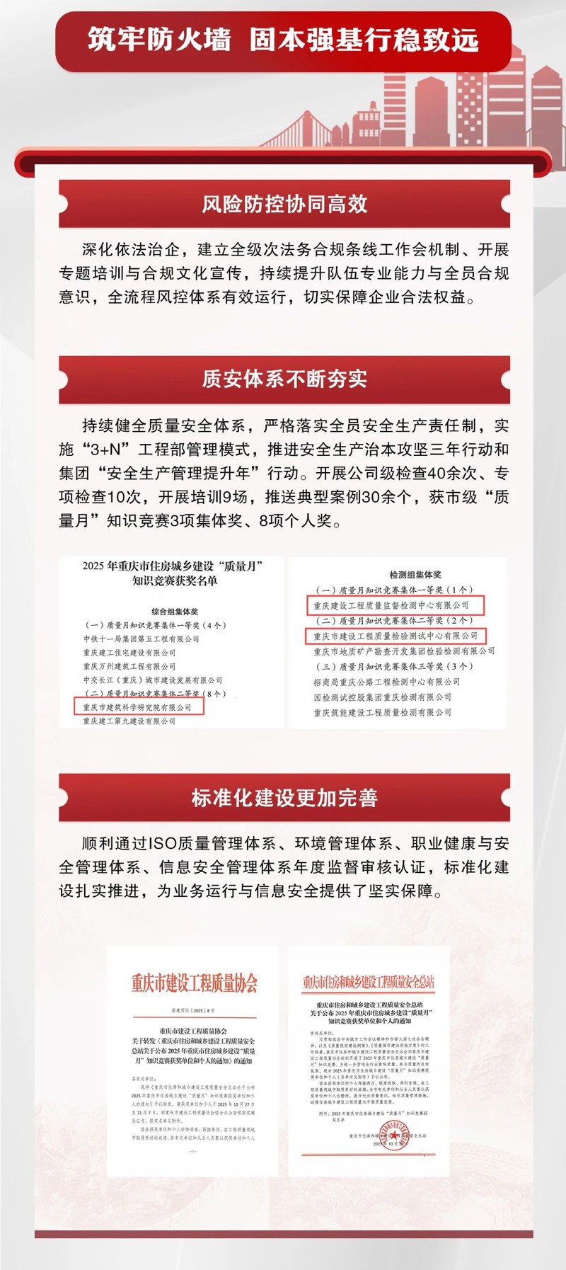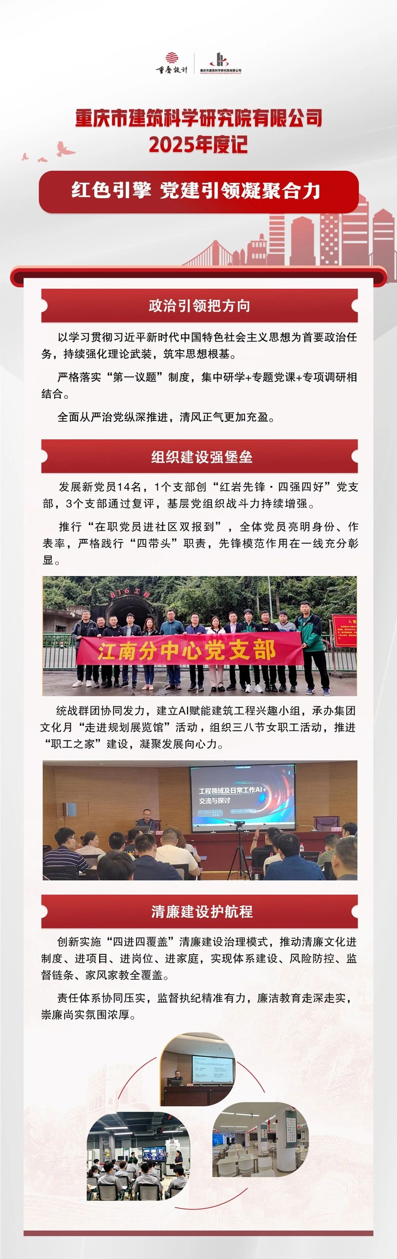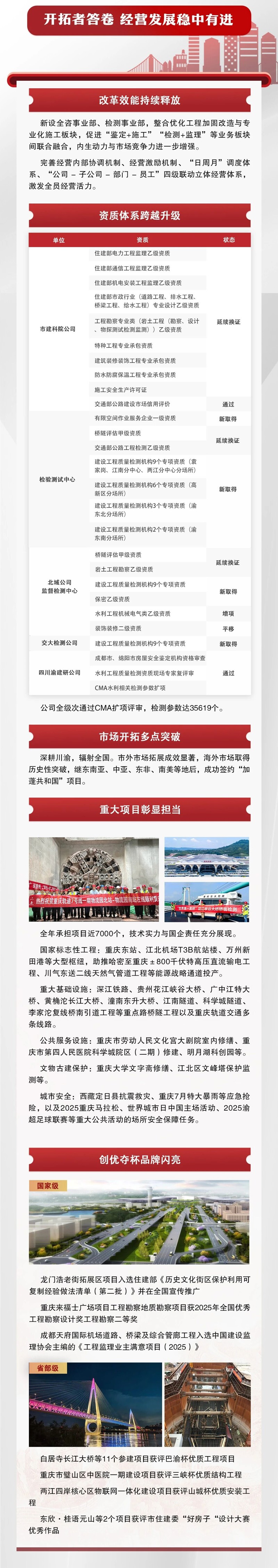 2025年,重慶設(shè)計集團(tuán)市建科院內(nèi)部融合持續(xù)深化,業(yè)務(wù)布局不斷完善,核心能力穩(wěn)步增強(qiáng),風(fēng)險防線更加牢固,黨建與業(yè)務(wù)同頻共振,發(fā)展基礎(chǔ)堅實穩(wěn)固。