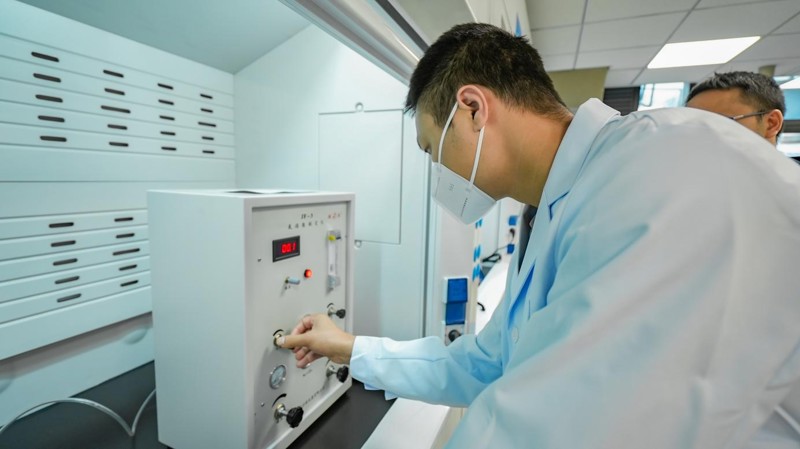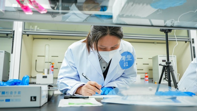 在決賽現(xiàn)場,理論考試結(jié)束,進入實驗環(huán)節(jié),以每6人一組進行分組比試,選手們嚴格按照標準對建筑保溫材料的氧指數(shù)進行檢測。李靖憑借熟練的操作手法一騎絕塵,贏得專業(yè)認可。